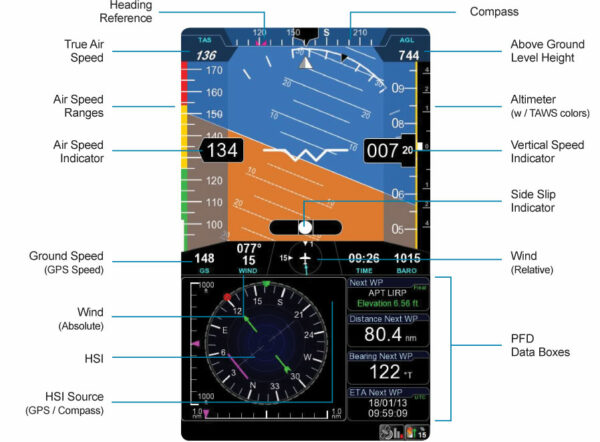 When connected to the A2 ADAHRS module, the EKP V transforms into a fully functional Primary Flight Display, presenting essential flight and attitude data clearly on its bright 7-inch screen.
